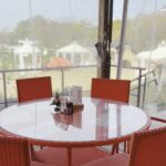 赤いチェアのテラス席。淡路島の野菜や地元食材を使った料理とスイーツを